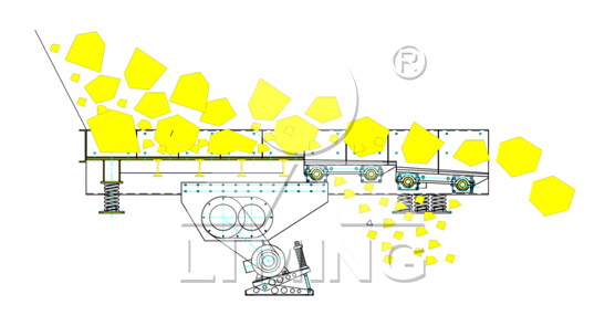 TSW給料機采用慣性式雙偏心軸激振器能產(chǎn)生定向激振力。兩軸之間有一對傳動比為1的齒輪副連接,保障其回轉(zhuǎn)方向相反,轉(zhuǎn)速相等。通過電動機驅(qū)動,兩偏心軸旋轉(zhuǎn),由于兩軸上的偏心質(zhì)量和偏心距大小相等,所產(chǎn)生的慣性力在一個方向互相抵消,而在另一個方向互相疊加,從而合成的定向激振力,使與此激振器剛性連接的給料槽體在支承彈簧上做強制振動,物料在振動力的作用下,在料槽上作滑動及拋擲運動,從而使物料前移而達到給料目的。當物料通過槽體上的蓖條時,較小的物料通過蓖條之間的間隙落下,不再經(jīng)過破碎而直接進入下道破碎工序,從而起到預篩分效果,充分保障破碎設備的破碎效率及能力。